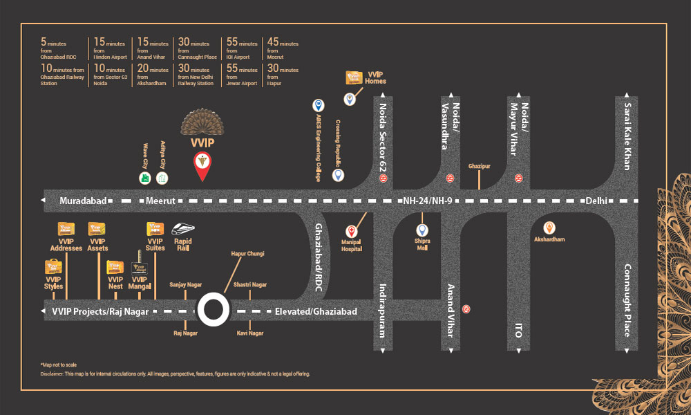 VVIP Namah offers well-connected living alongside the Aditya World City township’s best Shopping, Entertainment, School and Hospitality hotspots. The location ensures you are just a few steps away from the 14th Lane Wide NH-24 Highway, life at VVIP Namah is also known as culture, nurtures and influences our lifestyles through ideals